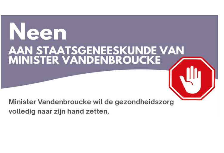 Op de affiche waarschuwt Bvas voor de "staatsgeneeskunde van minister Vandenbroucke". Volgens het artsensyndicaat probeert de minister de gezondheidszorg volledig naar zijn hand te zetten. Dat heeft voelbare gevolgen voor elke patiënt: langere wachttijden, minder gemotiveerde artsen en verlies van persoonlijke zorg.